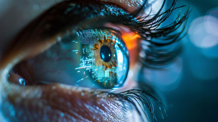 Human eye merged with glowing digital circuit patterns, symbolizing AI, biometrics, and cyber identity.