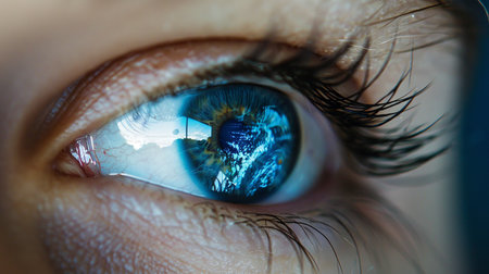 A close-up of a human eye with a vivid reflection of natural scenery, capturing a deep connection between sight and the environment