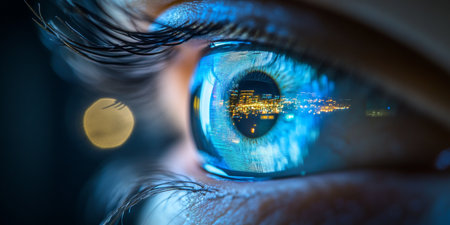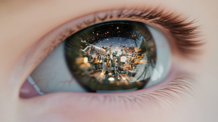 Close-Up of Human Eye Reflecting Cityscape at Night, Immersion Concept, Ophthalmology.