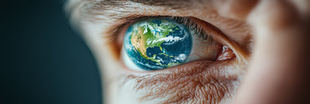 A captivating close-up of a human eye featuring a vivid iris that mirrors the Earth's surface, glowing with urban illumination, embodying worldwide insight and unity.
