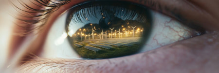 Closeup human eye reflecting fire, solar panels, and wind turbines, concept of AI Generated