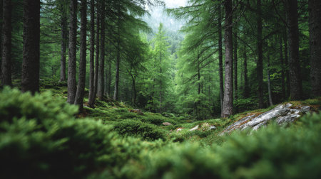 Explore a serene green forest filled with tall trees and soft moss covering the ground, inviting tranquility and connection with nature in every step.
