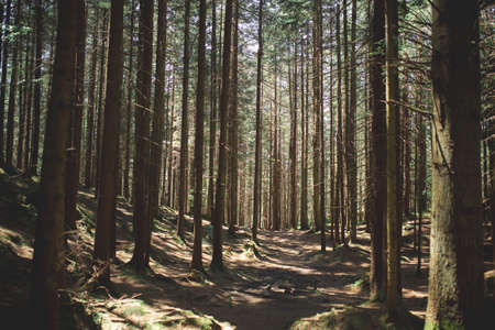 Atmospheric forest scenery with dirt road among firs in mountains. Scenic landscape with glade in mountain coniferous forest. Beautiful view to conifer trees in woodland. Stones on meadow in woods.