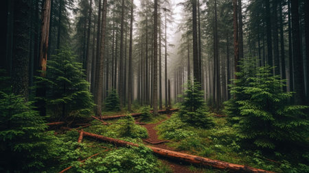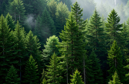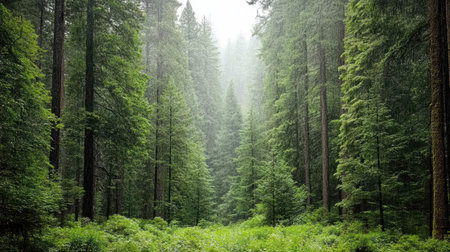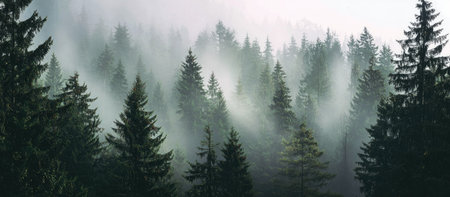 An atmospheric landscape features tall evergreen trees shrouded in thick fog. The scene is dominated by shades of green and gray, with soft lighting and a blurred background. Suitable for a variety of uses including environmental, travel, and natural beauty themes.