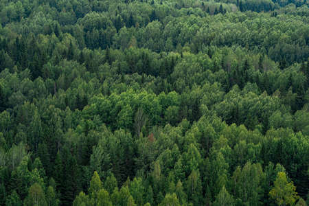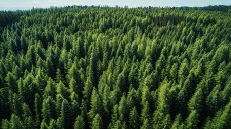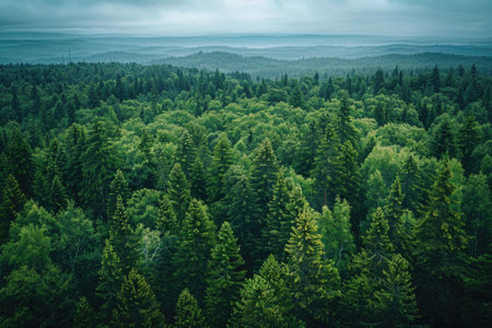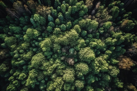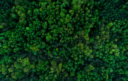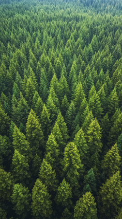 An overhead view reveals a dense forest, dominated by evergreen trees in various shades of green. The composition highlights the texture of the foliage and its layered arrangement. The style suggests a natural environment suitable for environmental concepts or background use, conveying a sense of serenity.