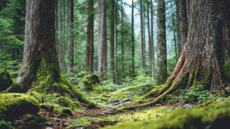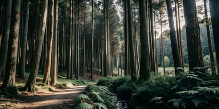 A captivating view of a serene forest pathway, showcasing tall trees with vibrant moss at the base, filtered sunlight creating a tranquil atmosphere in nature.
