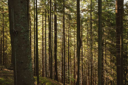 Sunlit green spruce forest slope viewed from distance. Atmosphere, magical nature, forestry, climate change and environment concepts.