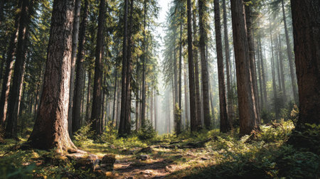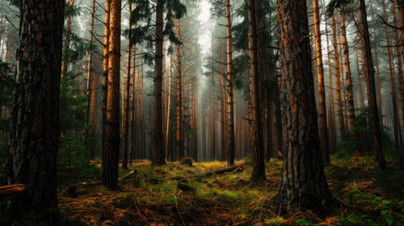 Mysterious foggy forest landscape with tall trees and soft light filtering through branches, creating enchanting atmosphere. ground is covered with lush greenery and fallen leaves