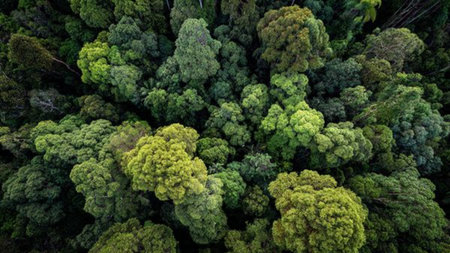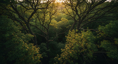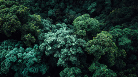 This aerial image captures the stunning beauty of a dense forest canopy, highlighting the rich variety of tree foliage in different shades of green, creating a tranquil atmosphere.