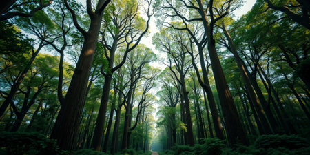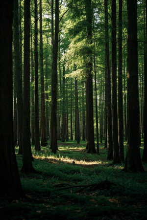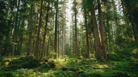 A serene forest scene showcasing tall trees with vibrant greenery and soft sunlight filtering through the canopy, creating a tranquil atmosphere perfect for nature lovers.