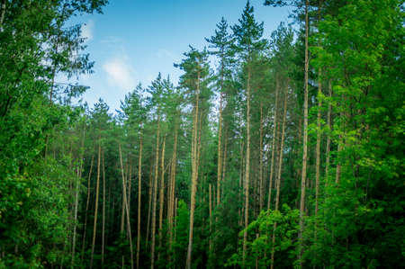 Beautiful landscape of pine forest in summer day. Nature Wallpaper. The tall trees of the pine trees growing in the old forest