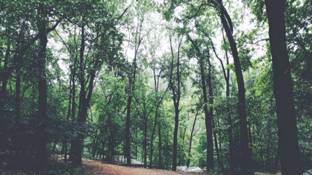 Low angle perspective of a dirt trail leading into a lush woodland. Tall trees with vibrant green leaves form a thick canopy, creating a serene and peaceful natural scene.