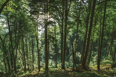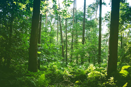 Sunset in the forest. Beautiful landscape of green trees and sunlight.