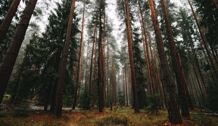 Pine forest in a foggy day. Beautiful autumn landscape.