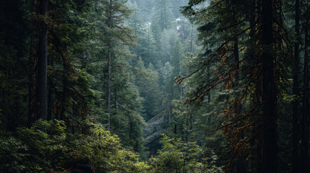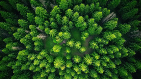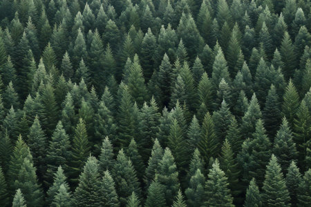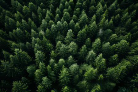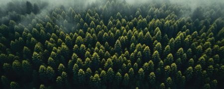 An overhead view reveals a dense forest canopy composed of numerous tall evergreen trees. The scene showcases a variety of green hues, with textures of needles and branches. The composition is framed by subdued lighting. The image suits commercial and editorial applications to depict nature or environment.