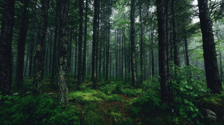 A serene and mysterious forest landscape with tall trees and green undergrowth shrouded in mist