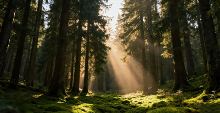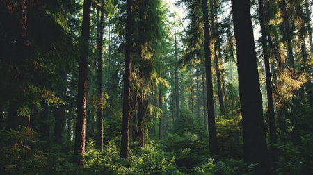 This captivating image captures a tranquil forest scene with tall trees and lush greenery, where gentle sunlight filters through thick foliage, creating a peaceful atmosphere.