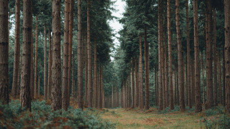 Discover a serene path winding through a majestic pine forest, surrounded by tall trees and lush greenery, inviting exploration in a peaceful natural setting.