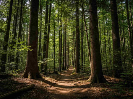 A path winds through a verdant forest, surrounded by tall trees and vibrant foliage. Sunlight filters through the canopy, creating a play of light and shadow. The composition focuses on the natural environment, likely suitable for illustrating themes of nature, travel, or environmental conservation, and various commercial purposes.
