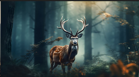 Close-up of a majestic deer with antlers in a tranquil forest during the early morning