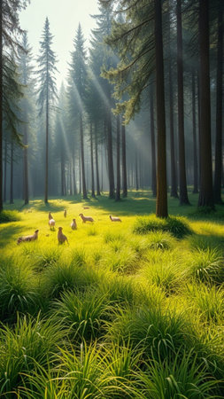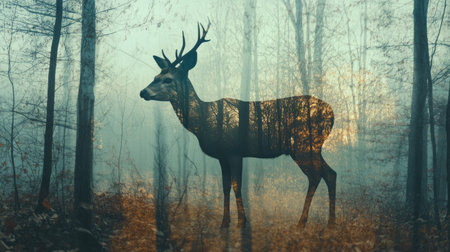 Two deer stand amidst a dense forest, their forms highlighted by soft, diffused lighting. The scene features tall, vertical trees shrouded in a light mist, creating a serene and somewhat mysterious atmosphere. This image is suitable for a variety of uses, including editorial and commercial projects.