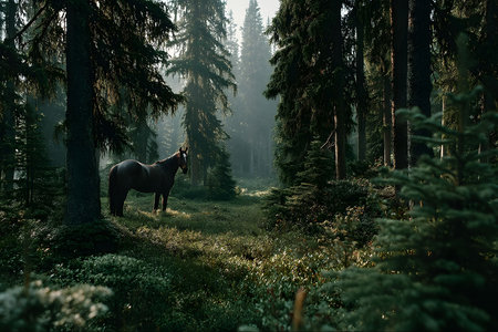 Majestic Horse in Sunlit Forest Clearing - Nature and Wildlife Photography for Wall Art Generative AI