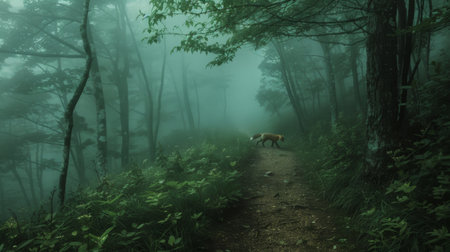 A lone fox standing on a misty forest path, creating a mysterious and serene scene in the dense woodland.