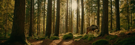 Bear in the forest at sunset. Panoramic view of a brown bear walking in the forest.