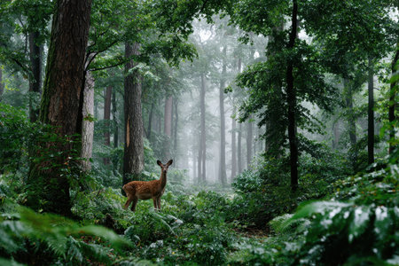 A serene deer stands amidst a misty forest, surrounded by tall trees and lush green moss, creating a tranquil, ethereal atmosphere.