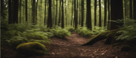 Trail in the green forest. Panoramic image. AI-generated.