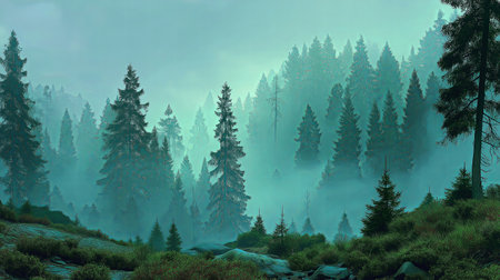 An atmospheric landscape features tall evergreen trees shrouded in thick fog. The scene is dominated by shades of green and gray, with soft lighting and a blurred background. Suitable for a variety of uses including environmental, travel, and natural beauty themes.