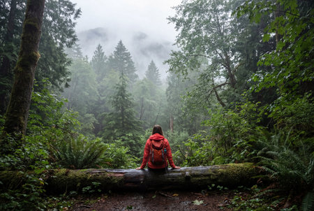 Woman in red rain jacket standing on a log in a dense forest surrounded by trees and mist, showcasing a moment of adventure and nature exploration, perfect for travel and outdoors themes