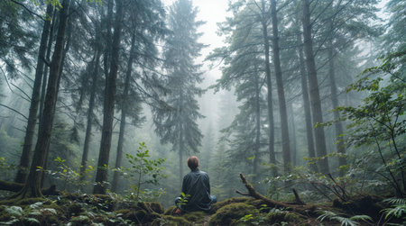 Person sitting on the forest floor surrounded by tall trees in fog