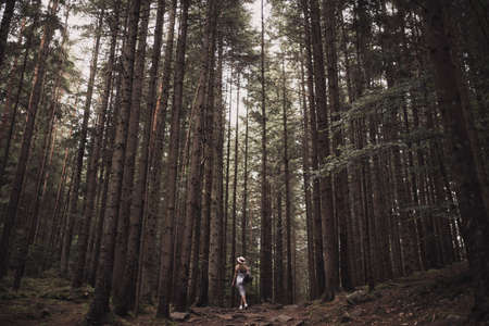 stone road in a coniferous forest in the mountains. Path in deep pine forest. Tatra mountains. Poland. ourney through the Carpathian forests and mountains