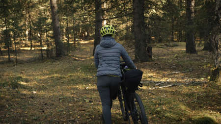 The woman travel on mixed terrain cycle touring with bike bikepacking. The traveler journey with bicycle bags. Magic forest park.