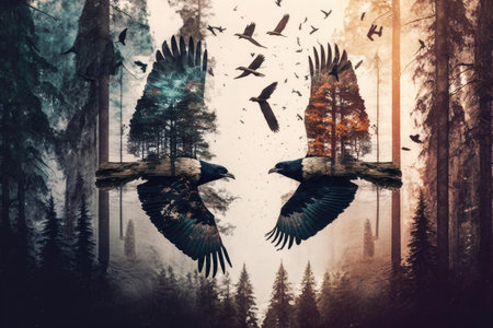 double exposure of birds soaring in flight over forest romantic background, created with generative ai