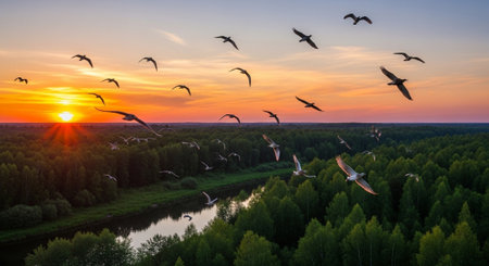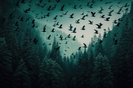 migratory flock of birds flying in formation over emerald green forest, created with generative ai