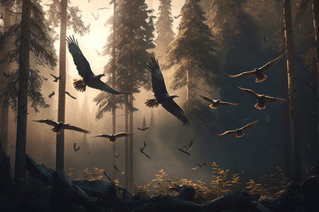 flock of majestic birds flying over forest, with the trees in the background, created with generative ai