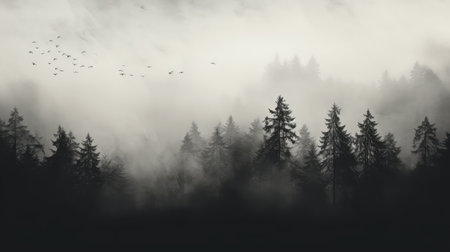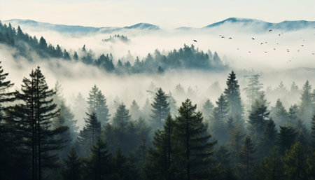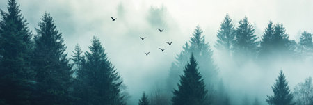 A captivating scene of birds soaring over a fog-drenched forest, where evergreen trees rise against a muted backdrop, evoking feelings of peace and nature's beauty.