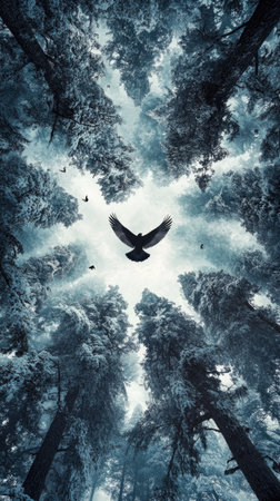 An overhead perspective captures a bird in flight amidst a forest of tall trees. The scene presents a high-angle composition with a color palette dominated by cool tones. The image suggests a natural environment and could be suitable for various commercial or artistic applications.