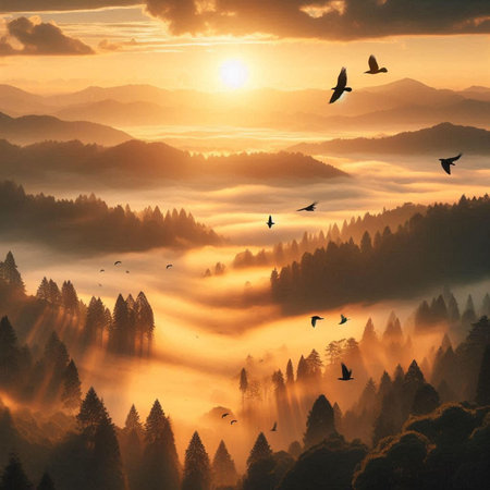A stunning mountain landscape at sunrise reveals gliding birds against a misty forest backdrop. The warm golden light creates a serene atmosphere in nature.