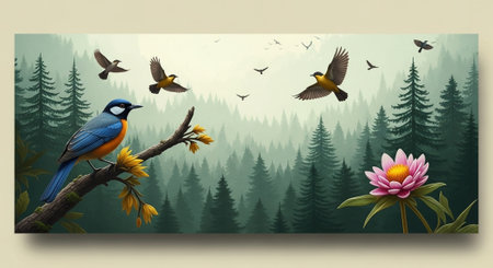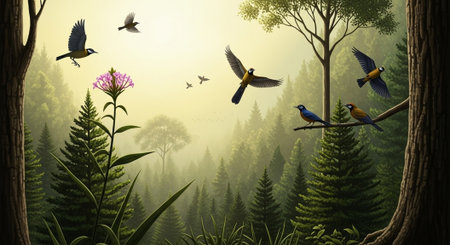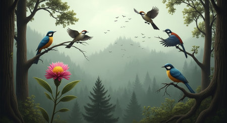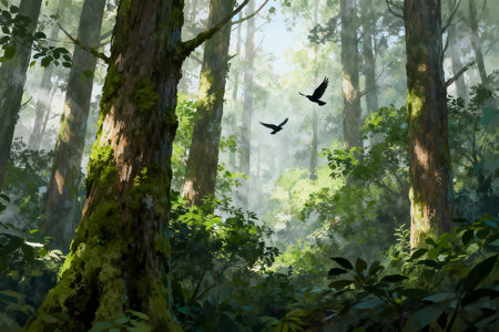 A tranquil morning in a misty forest showcases tall evergreen trees as birds soar gracefully above the foggy landscape, creating a peaceful ambiance.