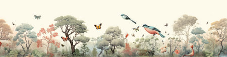 A serene scene featuring a flock of birds flying over autumn trees, showcasing a tranquil blend of nature's beauty and seasonal change.