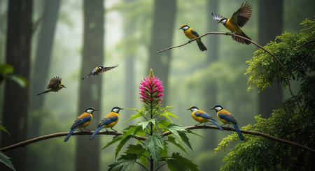 A magical bird with vibrant wings sits on a branch in a mysterious, fog-covered forest, its melodious voice filling the air.