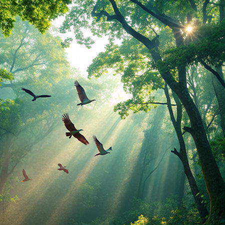An atmospheric and magical photograph of a flock of birds flying through beams of sunlight in a misty forest at dawn. This peaceful and inspiring shot symbolizes the beginning of a new day, the mystery of nature, and the feeling of freedom. A perfect visual for themes of hope, nature, freedom, and new beginnings.