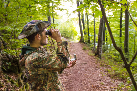 Soldier using binoculars and compass in forest
