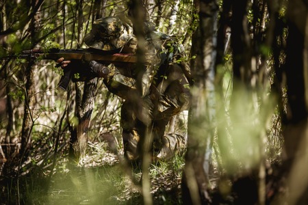 A modern warfare soldier on war duty in dense and dangerous forest areas. Dangerous military rescue operations