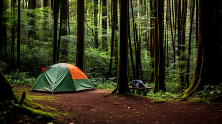 a tent in a lush and green forest surrounded by towering trees, created with generative ai