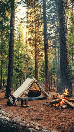 Camping in a serene forest with cozy tent, warm fire, and peaceful surroundings