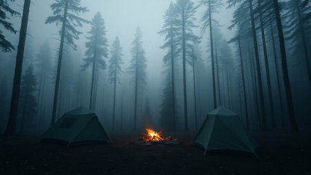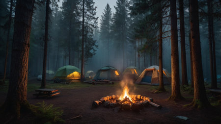Experience a peaceful camping scene at dusk, where a bright campfire flickers beside a warm tent in a foggy, serene forest setting. Discover the tranquility of nature.